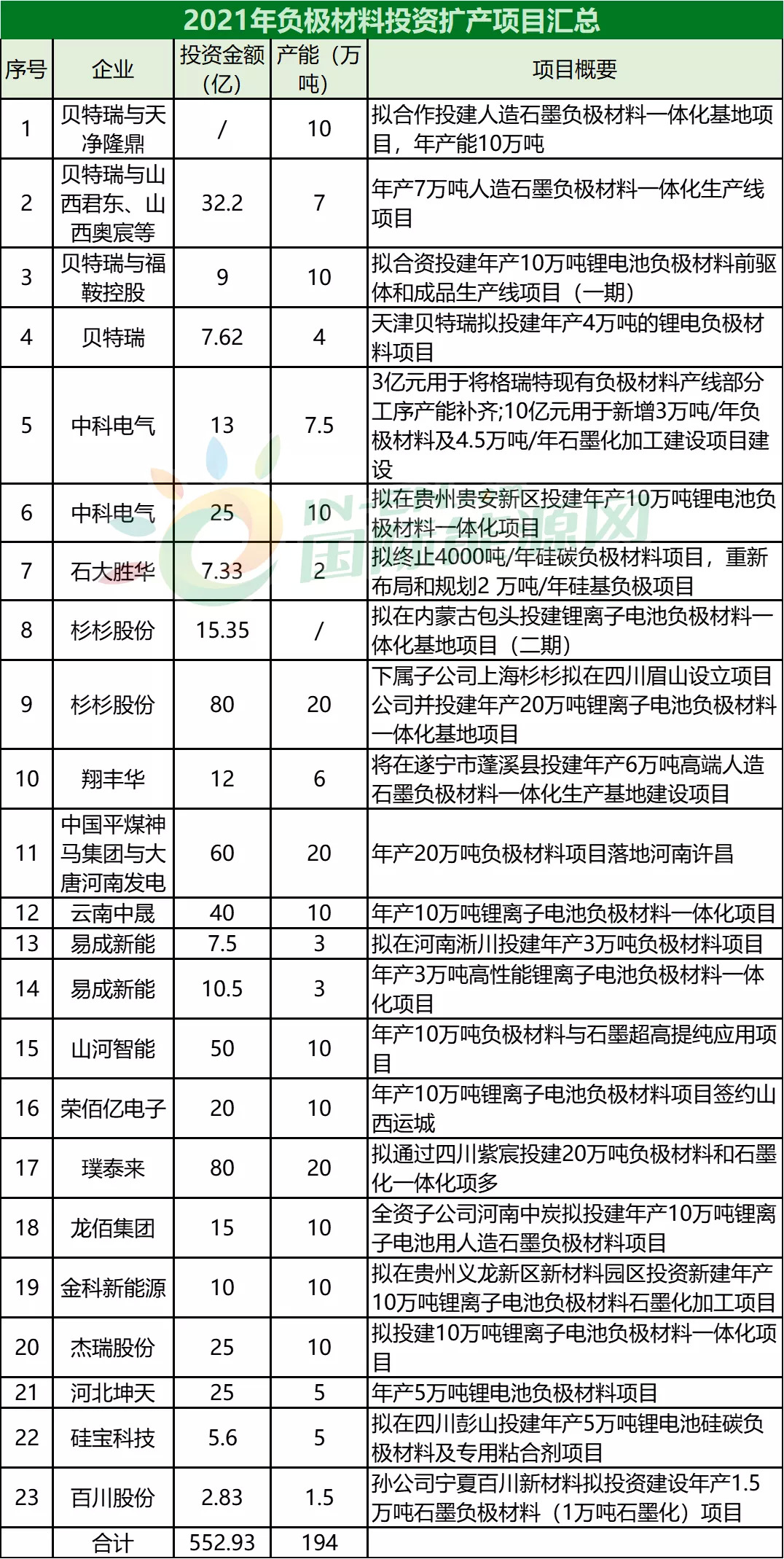 负极材料2021年新增规模比正极材料小得多,产能近200万吨,投资额约552.93亿元;