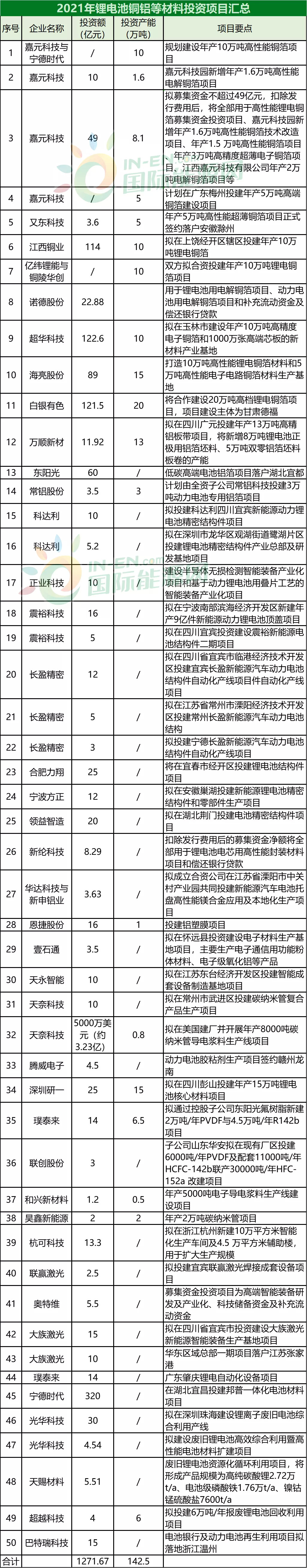 在铜箔、铝箔、设备、电池结构件等领域,50个项目中,公布产能的不多,只有142万吨产能,投资总额约1271.47亿元。嘉元科技是行业元老和巨头,不过今年江西铜业携带资源优势“气势汹汹”而来,出手即110亿元。