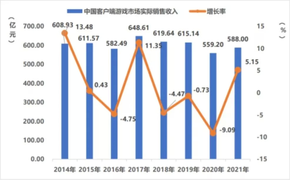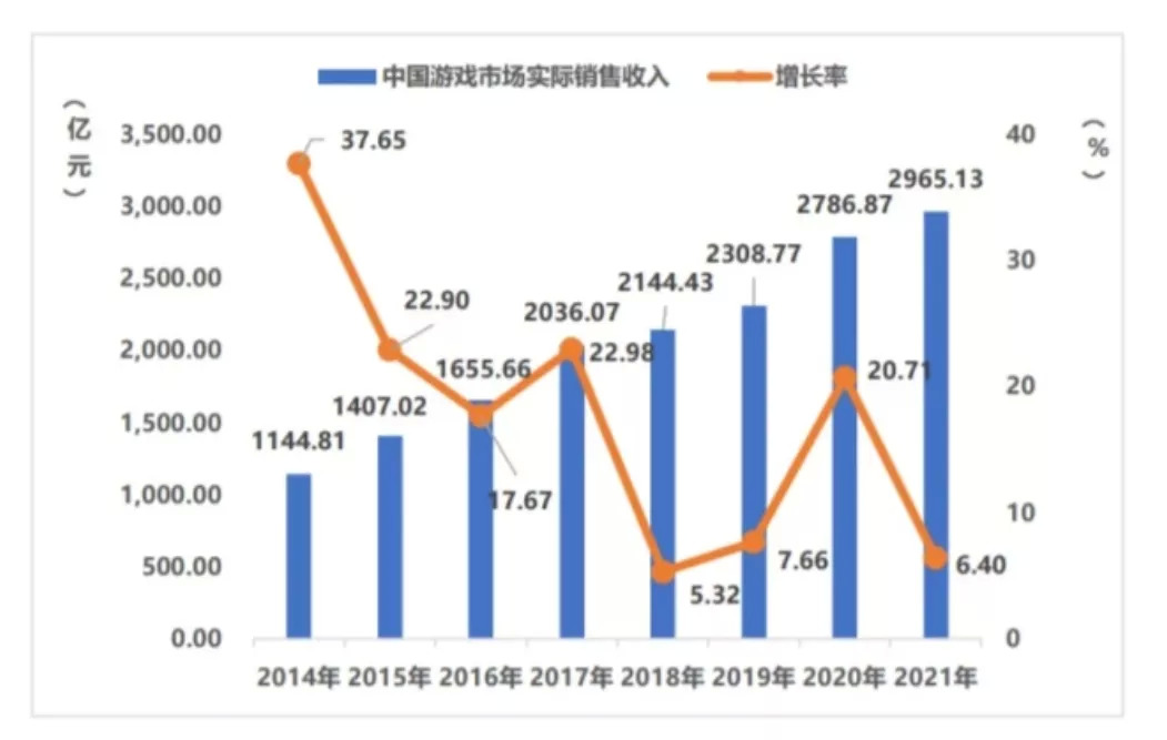不久前,中国音数协游戏工委(GPC)与中国游戏产业研究院发布了《2021年中国游戏产业报告》。在2021年里,中国游戏市场实际销售收入达2965.12亿,仍处于增长态势,但增幅同比缩减了15%,主要原因在于:去年新冠疫情下宅经济的刺激效应逐渐减弱;年度爆款数量同比有所减少;游戏研发和运营发行成本持续增加。