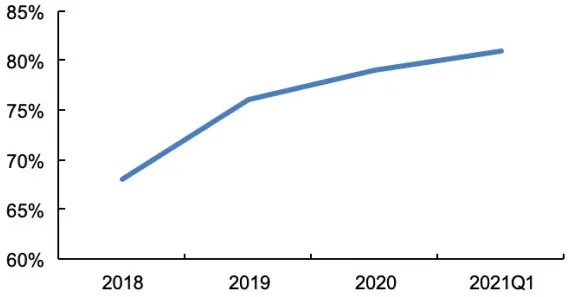 从2018年起至2021年第一季度,全球前五大动力电池厂商的市场集中度从67%上涨至81%。如果按前十家企业市场份额算,2020年这个数字占总市场份额比重,为98%。