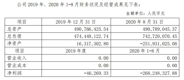 截止到2020年8月31日评估基准日,重庆荣丰经审计后的资产总额为4.91亿元,总负债为7.43亿元,净资产为-2.52亿元,2020年前8个月净利润为-2.68亿元(如下图所示);虽然资不抵债且大额亏损,但采用资产基础法评估后,股东全部权益价值为6.10亿元,评估增值8.62亿元,出现了高溢价。