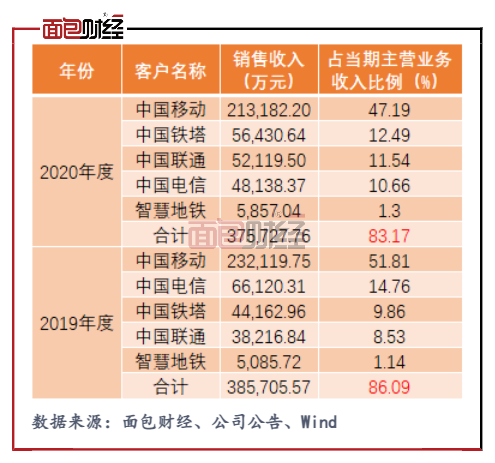 2019年和2020年,公司前五大客户均为中国移动、中国电信、中国铁塔、中国联通和武汉智慧地铁,前五大客户收入占主营业务收入的比例分别为86.09%、83.17 %,较为集中。可以看出,公司的主要客户为中国铁塔、三大运营商等大型政企单位,对于设备和项目质量考核严格,付款流程需多层级审批,从而对销售回款周期有一定影响。