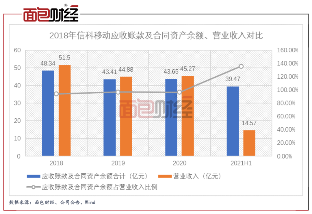 2019年至2021年上半年,信科移动应收账款(含合同资产)余额分别为43.41亿元、43.65亿元和39.47亿元,占当期营业收入比例为96.73%、96.41%和135.48%。