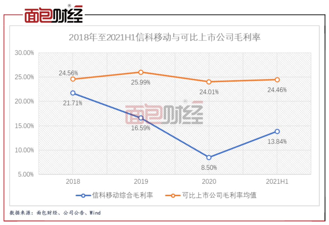除归母净利润暂未盈利之外,信科移动综合毛利率也处在较低水平。2019年至2020年上半年,公司招股书中提到的7家同行业可比上市公司毛利率平均值分别为25.99%、24.01%、24.46%。同期,公司综合毛利率分别为16.59% 、8.50%和13.84%,与可比公司毛利率平均水平存在差异。