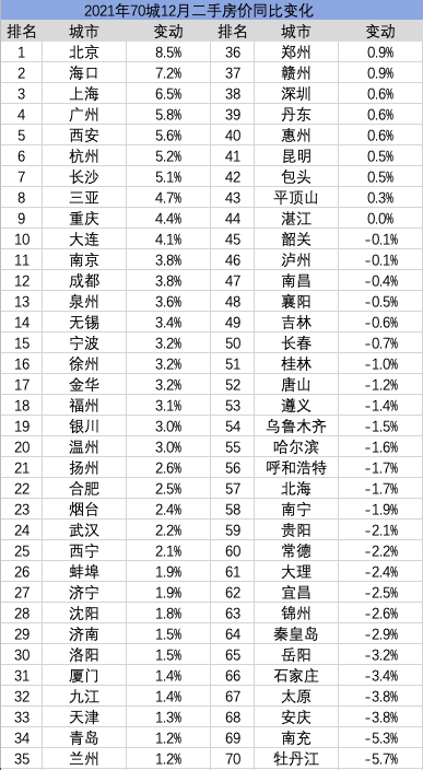 在43个同比增长的城市中,北京涨幅最大,2021年二手房价较上年增长了8.5%,其次是海口,涨幅达7.2%,上海位列第三,同比上涨6.5%。除了上述三地,年涨幅超过5%的还有广州、西安、杭州、长沙等4城,均为经济发展较好、人口流入较多的地区。