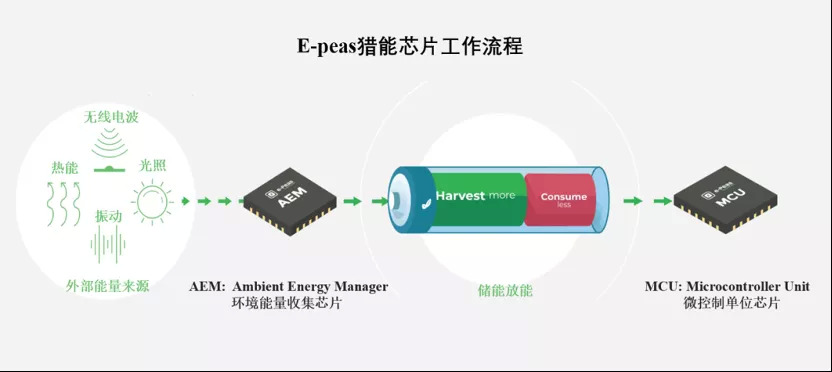 E-peas主打的“猎能技术”(Energy Harvesting)是一种从周遭环境收集、储存能量,并转换成电能的技术,可为智能装置提供稳定且源源不断的电能,实现无电池化。