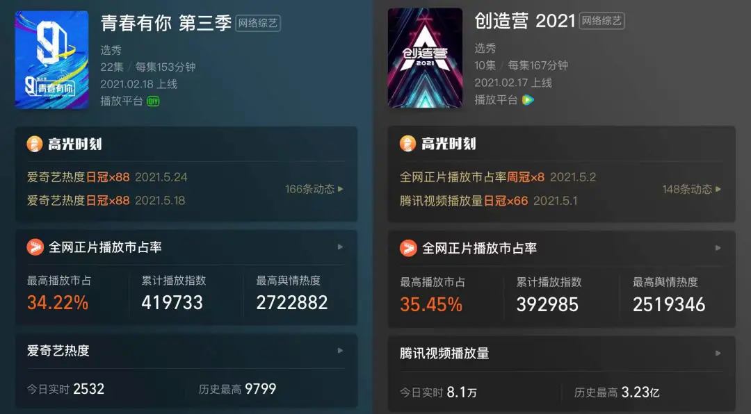 选秀的播放成绩突出,在今年也不例外。今年播出的老牌选秀IP《青春有你3》和《创造营2021》,均在灯塔专业版正片播放市占率的年榜前三名。平台深知受众的求新心理,在今年的选秀节目中都做出了改变——《青春有你3》增加舞台,改动主题曲环节,《创造营2021》大量引入国际选手,增加主题曲二创环节,都铆足了劲试图为原有的固定模式引入“活水”。
