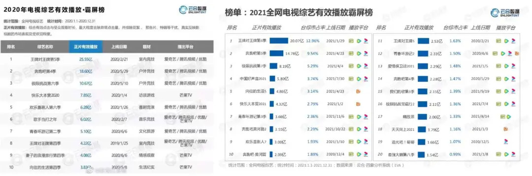 但与2020年、2019年相比,节目的有效播放量逐年下滑。以第一名《王牌对王牌》为例,去年《王牌5》有效播放量为25.5亿,今年《王牌6》降至20.07亿,《奔跑吧》《极限挑战》等老牌综艺IP的有效播放同样下滑。