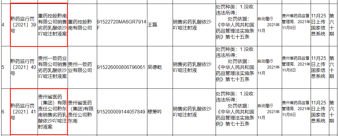 另一份行政处罚决定书(黔药监行罚〔2021〕41号)显示,贵州省医药(集团)有限责任公司黔东南存在销售劣药乳酸依沙吖啶注射液的违法事实,贵州省药品监督管理局决定没收其违法所得。