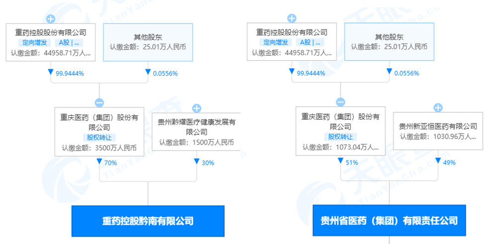 天眼查APP显示,上述被罚的重药控股黔南有限公司和贵州省医药(集团)有限责任公司,第一大股东均为重庆医药(集团)股份有限公司(简称“重庆医药”)。其中,重庆医药对重药控股黔南有限公司持股比例为70%, 对贵州省医药(集团)有限责任公司持股比例为51%。