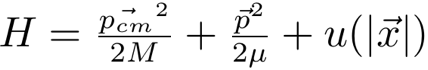 在这个新形式的哈密顿量中,第一项是关于质心运动的,而第二项与第三项是关于相对运动的,从而波函数的质心运动部分与相对运动部分可以分开。