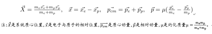 张朝阳讲到,根据势能只与电子和质子的相对距离有关这个性质,可考虑将电子与质子组成的二体系统,分解为相对运动与质心运动,新的这组变量与原来的质子电子变量形成关系。