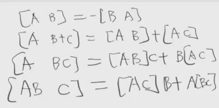 他指出,算符可以相加,算符之和作用到波函数上,定义为分别作用到波函数上再求和。加法满足交换率与结合率,跟传统的加法无异,但是算符的乘法就与传统的乘法非常不同了。算符之积作用到波函数上,定义为先作用右边的算符再作用左边的算符。这样算符的乘积里左边算符与右边算符位置是不能随意交换的,即算符之积不满足交换率,这导致了量子力学与经典力学有非常不同的性质。为了描述这种乘积顺序的不对易性,我们引入“对易关系”,将两个算符之积的不同顺序相减,具体用数学符号表示为: