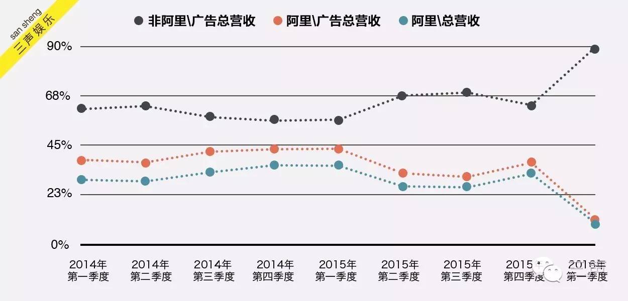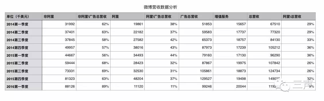 《三声》统计了从2014年第一季度到2016年第一季度9个季度的微博营收数据,发现拐点出现在2014年第三季度和2015年第二季度。从2014年第三季度开始,阿里对微博营收的贡献开始提升,连续3个季度在微博广告营销营收中占比超过40%,在微博总营收中占比超过30%。