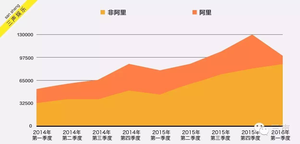 微博非阿里广告收入不断增长,阿里广告收入在微博营收中的数额却没有出现大的变化。抛开“双11”所在的2015年第四季度不算,与阿里终止战略合作的2016年第一季度的非阿里营收比2015年第三季度增长了20%,阿里营收则下降了66%,但是微博整体广告营收仅下降了6%,而总营收仅下降了4%。