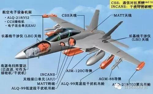 EA-18G“咆哮者”是美军性能最新装备的一款电子战作战飞机。这种电子战飞机是在F/A-18战斗攻击机的基础上研制而成,具有超强的电子作战能力。