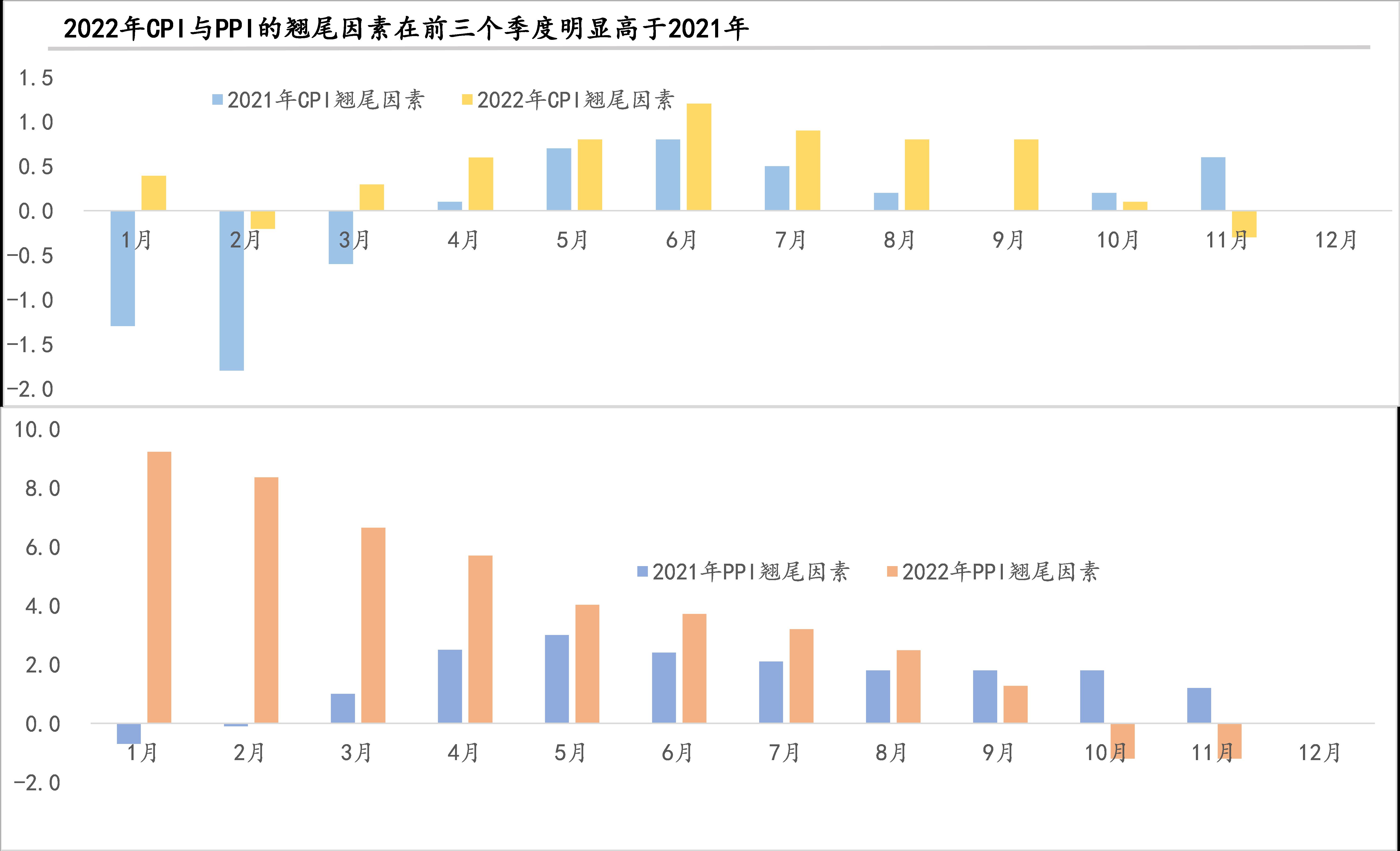 第四,就通胀走势而言,今年一季度甚至前4个月可能是降息的最好窗口期。我们可以将2022年物价水平分为翘尾因素和新涨价因素,前者是已知因素,全年各月走势已经可以通过2021年各月CPI数据计算得出(所谓翘尾因素,是指上年价格变化对本年同比价格指数的影响,正的翘尾因素会推高下一年的物价指数)。