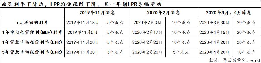 回溯2019年8月LPR形成机制改革以来政策利率与LPR的调整时点和幅度,可以发现,自2019年11月以来,央行三次下降政策利率后,LPR都会跟随调整,一年期LPR调整幅度相同,5年期LPR调整幅度则可能相同、也可能减半。