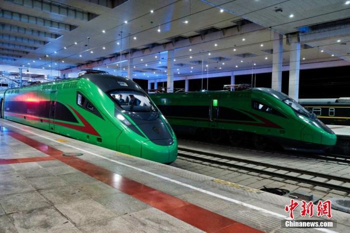 1月17日,拉萨火车站内,两列复兴号动车组列车整装待发。当日,西藏2022年春运在拉萨火车站拉开序幕,西藏春运首次进入动车时代。中新社记者 江飞波 摄