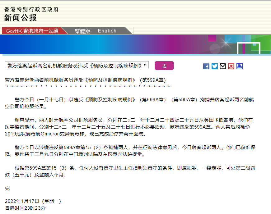 据香港特区政府新闻公报,香港特区警方1月17日以违反《预防及控制疾病规例》(第599A章)拘捕并起诉2名前航空公司机舱服务员。