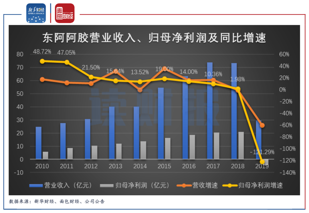 数据显示,东阿阿胶2019年营收同比下降59.68%;归母净利润同比下降121.29%,由上年盈利20.85亿元转为当年亏损4.44亿元。这也是公司1996年上市以来首次录得全年亏损,业绩压力可想而知。