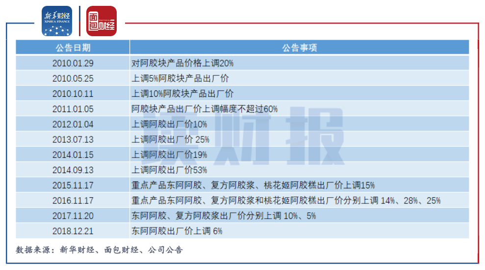 图4:2010年至2018年东阿阿胶核心产品提价情况