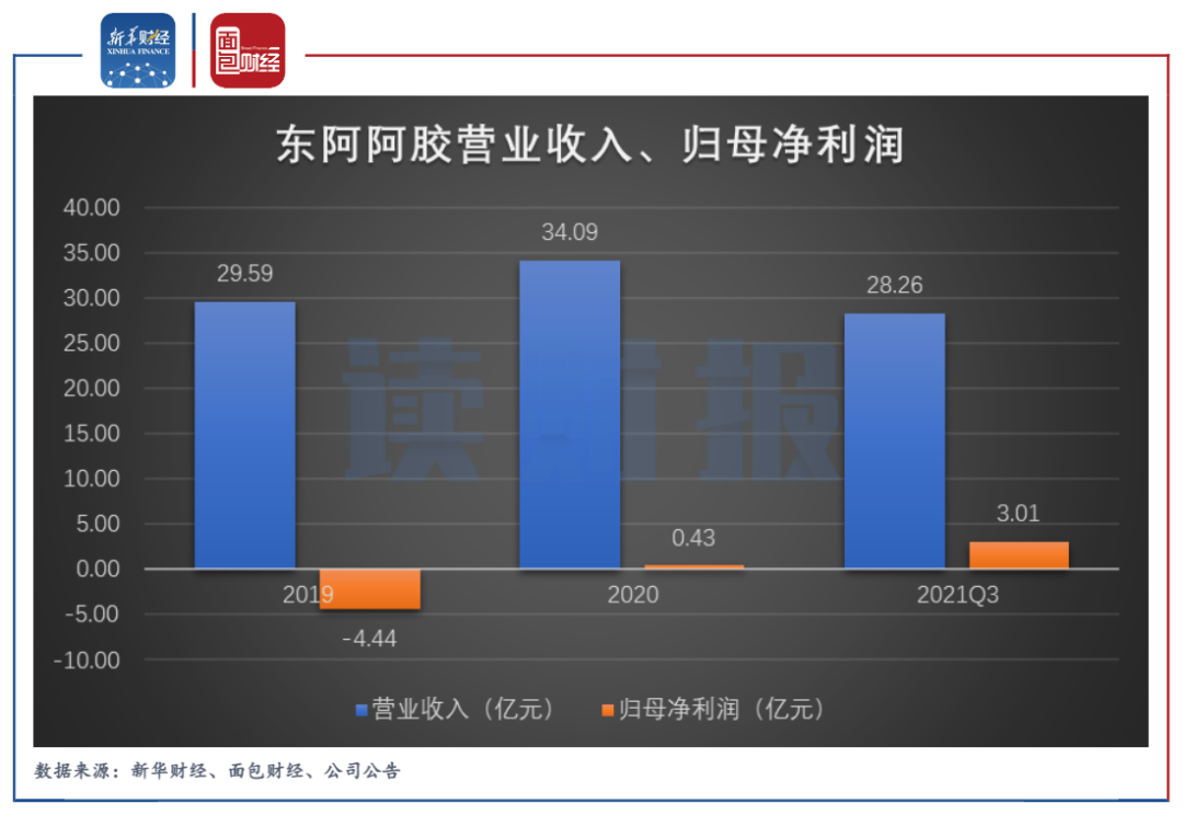 自2019年12月韩跃伟上任后,东阿阿胶业绩有所回暖,2020年实现营收同比增长14.79%,归母净利润扭亏为盈;2021年前三季度,公司营收同比增长38.49%至28.26亿元,归母净利润同比增长1535.77%至3.01亿元。
