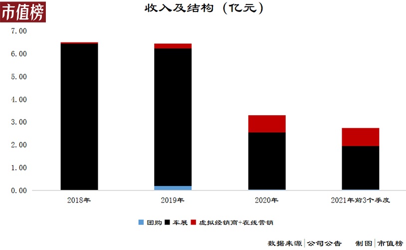 2021年团车情况也不是很乐观,线下车展业务前三个季度收入1.9亿元,第四季度往年是旺季,即使和前三个季度收入相同,这部分全年收入也低于2019年。虚拟经销商和在线营销的势头相对强劲,占收入的比重达到了30%。