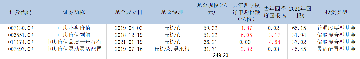 日前,作为中庚基金“顶梁柱”,丘栋荣管理的四只基金披露了去年四季报。