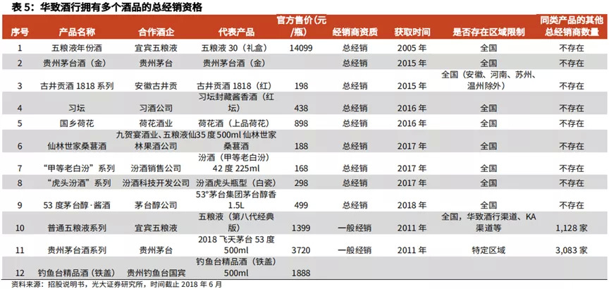 其中华致酒行以代理茅五产品为主(分别于2006年、2009年拿下五粮液、茅台经销权),包括飞天茅台、茅台年份酒、普通五粮液,以及一些定制酒产品。