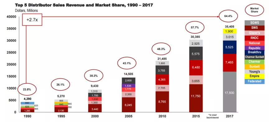 据Park Street数据显示,2017年,美国前10大和前5大经销商分别占据全美酒水市场74%和64.4%的销售额。