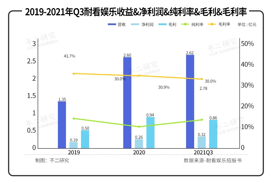 据其招股书显示,2019年、2020年及2021前三季度,耐看娱乐的收益分别为1.35亿元、2.60亿元和2.62亿元;净利润分别为1927.3万元、2584.5万元和3226.5万元;纯利率分别为14.3%、10.0%和12.3%。