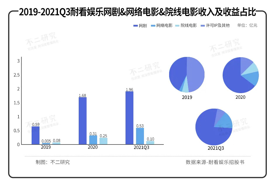 按照业务线,耐看娱乐的营收来源于网剧、网络电影、院线电影、许可IP及其他。