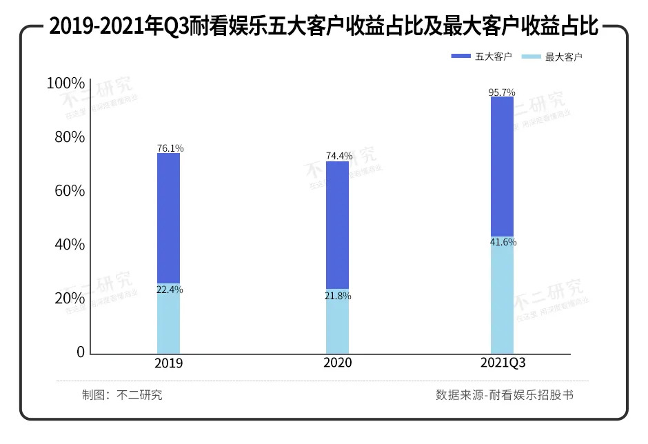 据招股书显示,2019年、2020年及2021前三季度,耐看娱乐总计收入6.57亿元;来自最大客户的收益占同期总收益分别约22.4%、21.8%及41.6%。虽然收入可观,但收入来源较为单一。
