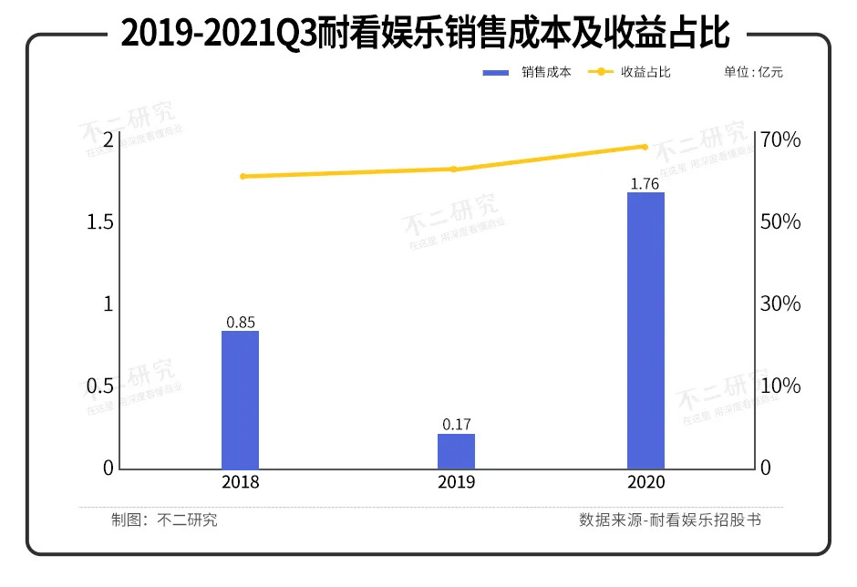 与此同时,在支出方面,2019年、2020年及2021前三季度,耐看娱乐的销售成本分别为8517.2万元、1655.9万元和17616.8万元,占总收益的63.11%、63.75%和67.30%。