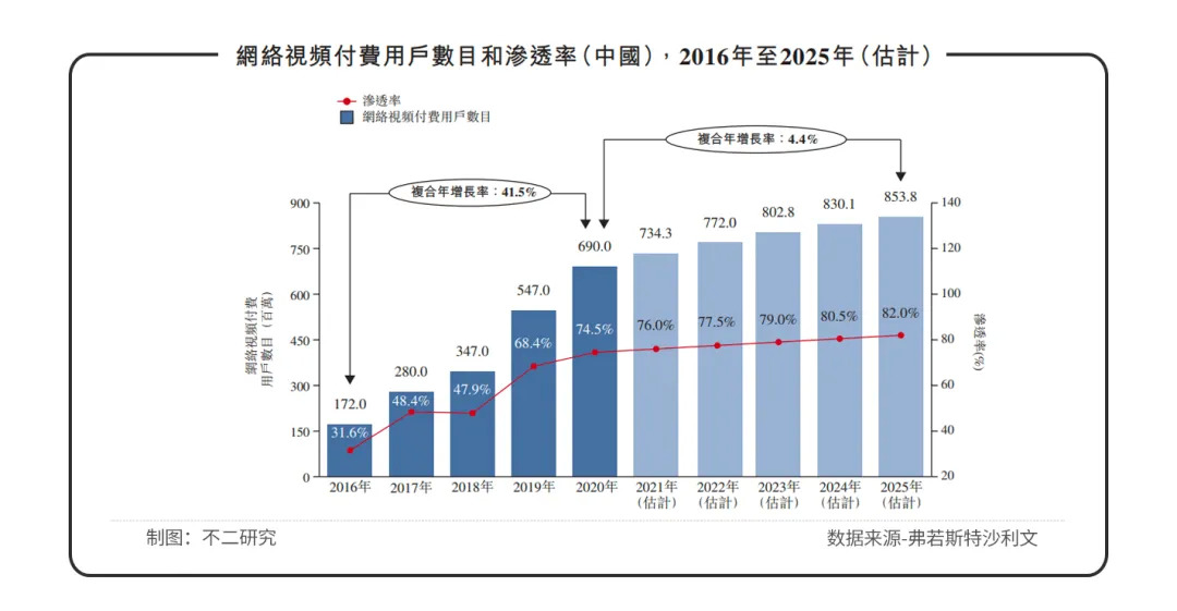 由于爱奇艺、优酷、腾讯视频、芒果TV、哔哩哔哩等主要网络视频平台的崛起,据中国互联网络信息中心(CNNIC)数据显示,2020年中国网络视频付费用户整体渗透率高达74.5%,渗透率将在2025年将达到82.0%。付费用户数目预期在2025年将达到85380万名,2020年至2025年复合年增长率为4.4%。