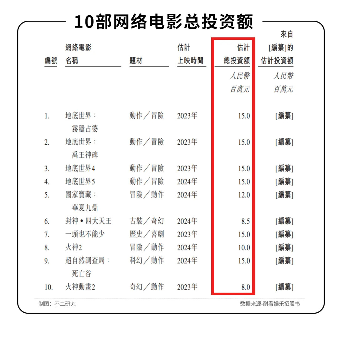 同时,拟将部分募资用于制作10部网络电影,这些网络电影的总投资额合计为1.29亿元;拟将部分募资用于为3部共同投资院线电影拨付资金,这些院线电影的总投资约为1.5~2亿元。