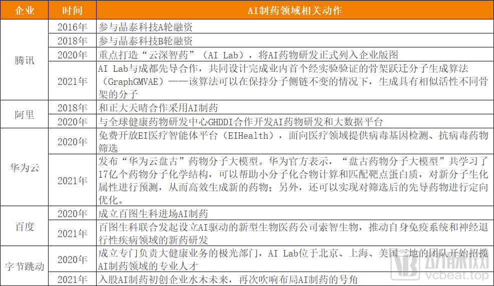 其实,不仅是国外的谷歌这一类IT巨头在AI制药领域“开疆辟土”,“蹭”市场热度的同时催升行业热度,国内的IT巨头们近两年也在AI制药领域“动作频频”,迎合市场热情的同时,进一步使得该领域的热度不断攀升。