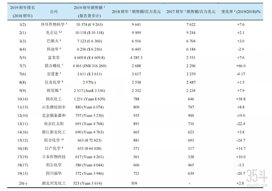 1. 根据相应财年原始报告货币兑美元的年平均汇率换算得出;2. 以美元计的销售额的同比变化率;3. 不包括种子&性状及环境科学业务的销售额;4. 已归属先正达集团;5. 不包括草坪园艺植保业务及种子&性状业务的销售额;6. 不包括种子和性状业务的销售额;7. 本榜单采用联合磷化2020财年及2019财年数据,分别截止于2020和2019年的3月31日(联合磷化于2019年1月完成对爱利思达的收购,所以2019财年仅包含2个月的爱利思达的销售额);8. 2019和2018财年的销售数据分别截止于2020和2019年的3月31日;9. 2019和2018财年的销售数据分别截止于2019和2018年的7月31日;10. 2019和2018财年的销售数据分别截止于2019和2018年的10月31日。