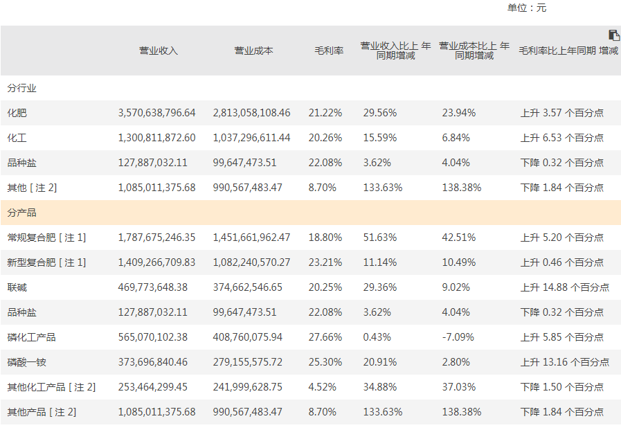云图控股表示,去年公司复合肥产品销量与毛利率同比增加,同时其联碱产品销售价格同比上涨,毛利率同比增加。就2021年半年度报告来看,该公司旗下化肥类产品毛利率提升3.57个百分点至21.22%,磷化工、磷酸一铵、联碱等化工类产品毛利率上升6.53个百分点至20.26%,品种盐产品毛利率微降0.32个百分点至22.08%。