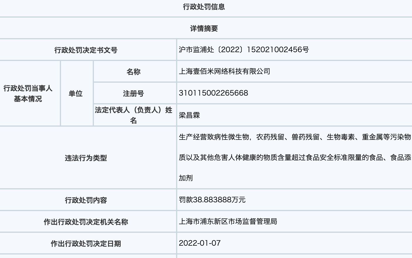 根据上海市场监督管理局网站公示的行政处罚信息,近日,叮咚买菜关联公司上海壹佰米网络科技有限公司新增一则行政处罚,违法行为类型为生产经营致病性微生物,农药残留等污染物质以及其他危害人体健康的物质含量超过食品安全标准限量的食品、食品添加剂,被罚约38.88万元,处罚单位为上海市浦东新区市场监督管理局。