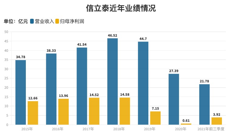 事实上,自集采实施后,信立泰业绩便遭受重挫。2018年-2020年,公司业绩一路下滑,营业收入从2018年的46.52亿元缩减至2020年的26.39亿元,与此同时,归母净利润更是从14.58亿元骤降至0.61亿元。