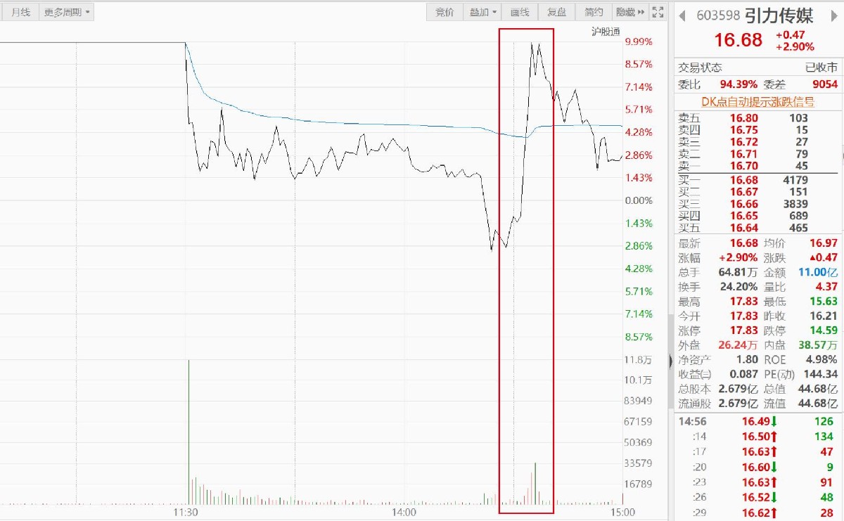 当日上午开盘,引力传媒即封死涨停板,不过,下午开盘后1分钟股价急速下挫约5%,日内最低价为15.63元(-3.58%),14:30后,出现3分钟内从-0.99%(16.05元/股)迅速拉升至9.99%(17.83元/股)涨停价的一次异动,最终以16.68元收盘,涨2.90%。