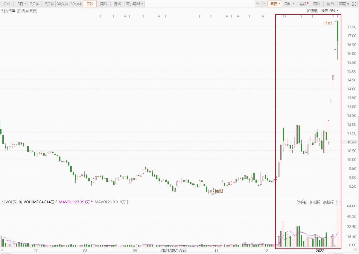 引力传媒股票这一轮异常波动最早出现在2021年12月10日(周五)和13日(周一),该股在这两日连续涨停,经过一段时间的调整之后,又出现了近日的连续数天涨停的情况。