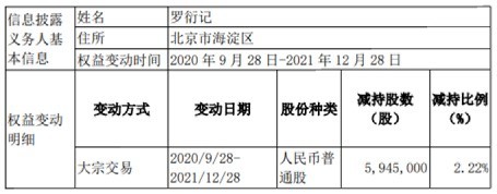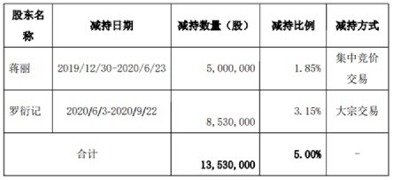 更早前,2019年12月30日至2020年9月22日,罗衍记及其一致行动人蒋丽通过集中竞价和大宗交易方式累计减持公司股份1353万股,占公司总股本比例为5.00%。