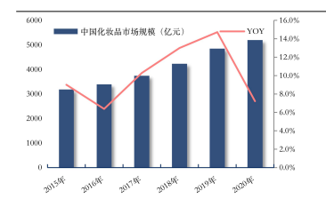 根据欧瑞数据,2020年化妆品行业市场规模5200亿,同增7.2%,2015-2020 年复合增速为10.3%,2020年受疫情影响化妆品行业增速有所放缓,整体仍保持较高景气度;其中护肤品2020年市场规模为2701亿元,2015-2020年复合增速为 10.9%,彩妆2020年市场规模为596亿元,2015-2020年复合增速为 18.7%,化妆品行业整体呈现较高景气度。