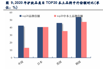 从全球经验看,2020年护肤品日本、韩国、美国、中国市场 TOP20 品牌中本土品牌份额分别为 36.5%、47.6%、35.4%、13.2%,占比TOP20品牌份额比重占比分别为 89.5%、76.6%、88.0%、30.9%,中国市场本土品牌在国内竞争力与海外市场存在较大差异。