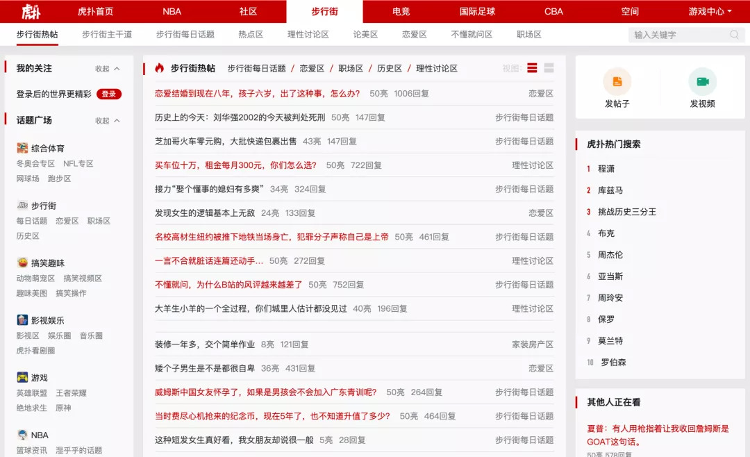 如果说小红书是女性的聚居地,那么虎扑则被称为“直男的天堂”。