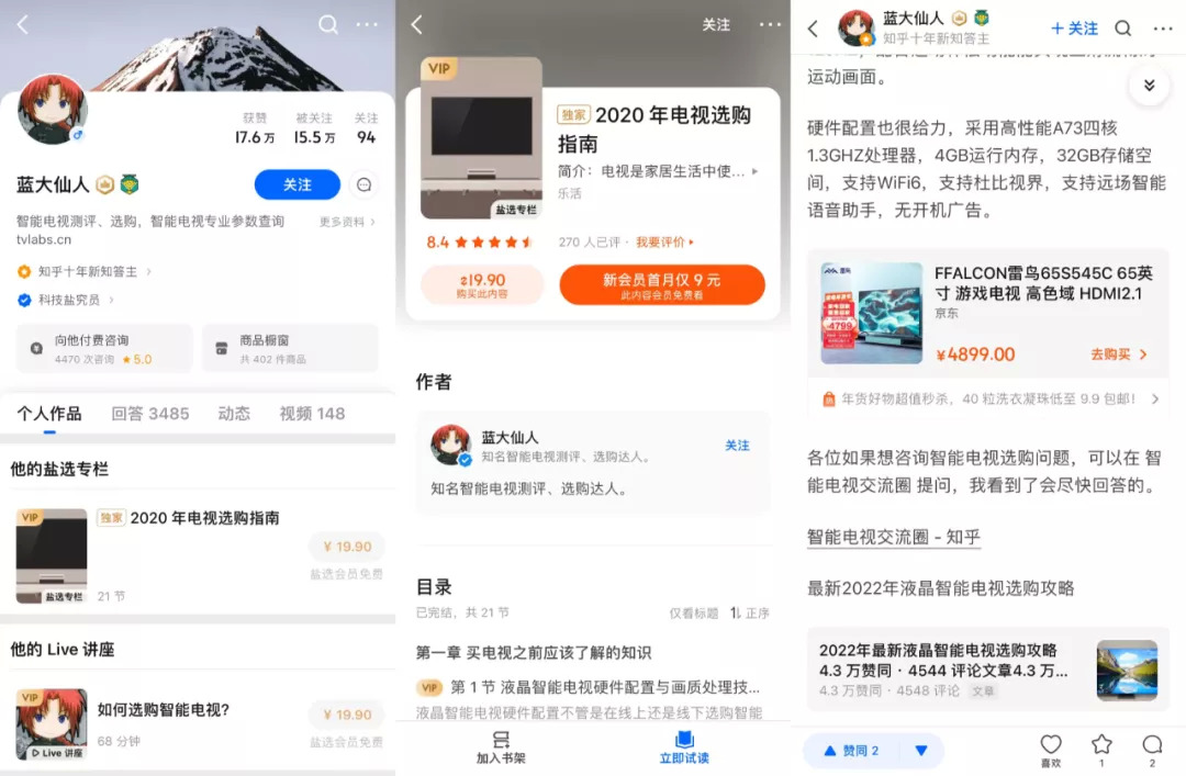作为知乎打造的“知识带货博主”,“蓝大仙人”2020年在知乎上写的智能电视介绍文章成为爆款,获得3.2万赞,创下单篇带货量超过5000万GMV的记录,目前蓝大仙人在知乎拥有15.4万粉丝。据观察,“蓝大仙人”在知乎的变现方式主要是发布测评文章,文末附带京东等电商平台连接,当用户通过他的文章链接,转向平台购物时,他就可以获得佣金。这种方式与常见的淘宝客相似,也是知乎博主常用的变现方式。在这之前,“蓝大仙人”曾爆料,其年收入在50-100万之间,位于自媒体的腰部区间。