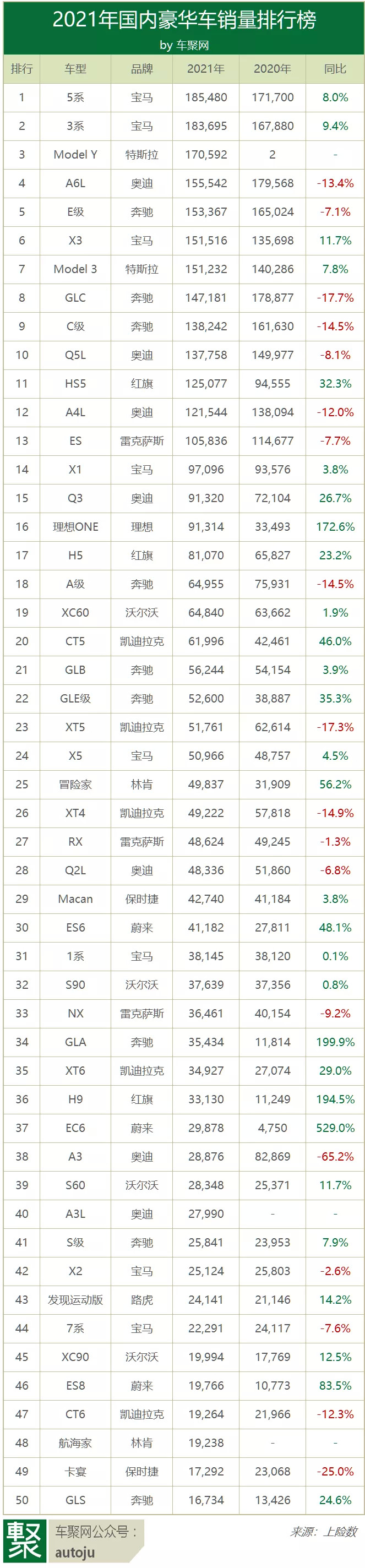 宝马旗下3款车型入围2021年豪华车销量Top10。其中5系和3系全年销量均超18万辆,依次位居冠亚军,同时,它们更是多次双双跻身轿车榜前10位。X3以15.15万辆位居第6位,同比增长11.7%。看来,买豪华车性能是刚需啊。